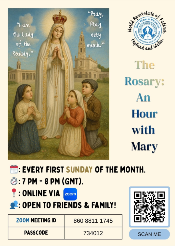The World Apostolate of Fatima England and Wales warmly invites you to its first Formation Conference, taking place on 23 May 2026 at 8:00 AM at Our Lady of Fatima Church, Commonwealth Avenue, White City, W12 7QR.