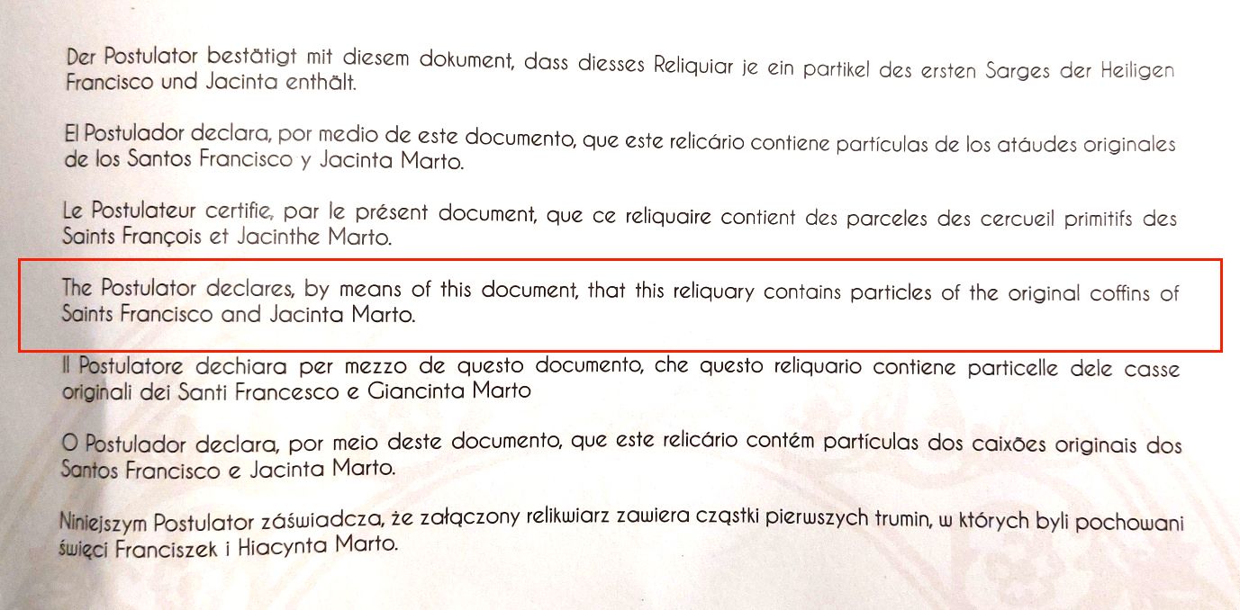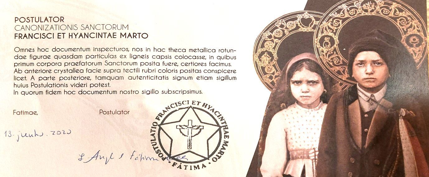 Note: The certification provided by the Postulator of Saints Jacinta & Francisco declares that thereliquaries contain particles of the original coffins of Saints Jacinta and Francisco Marto.