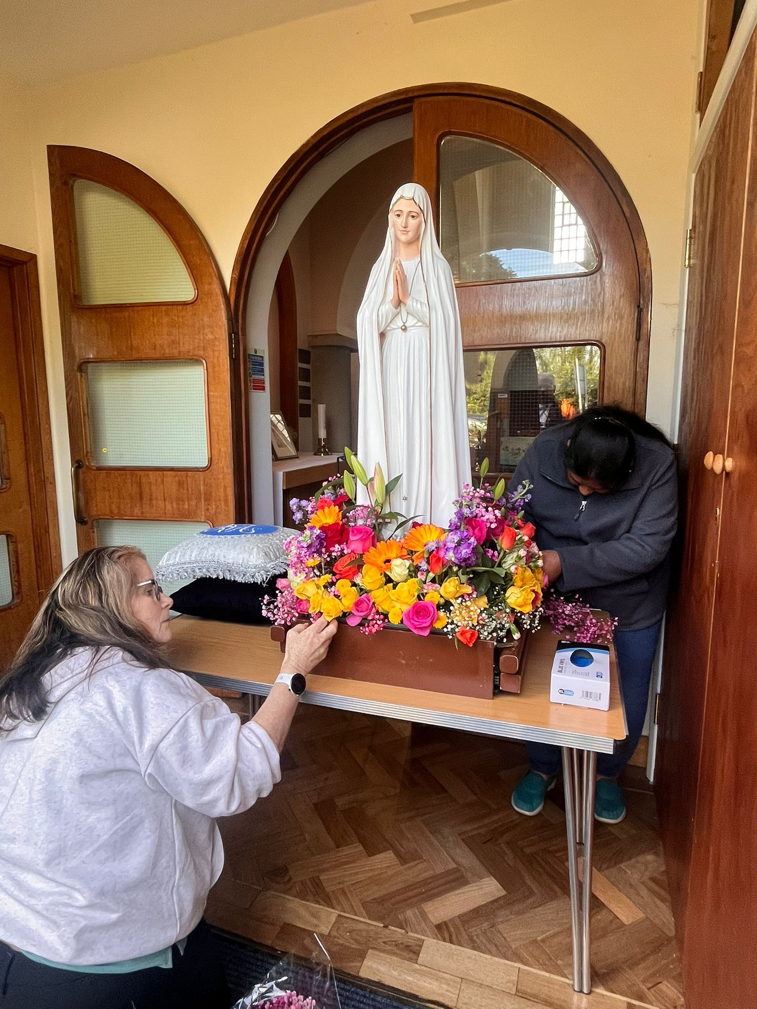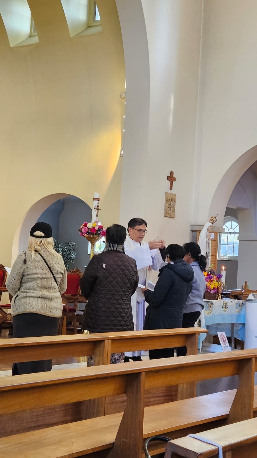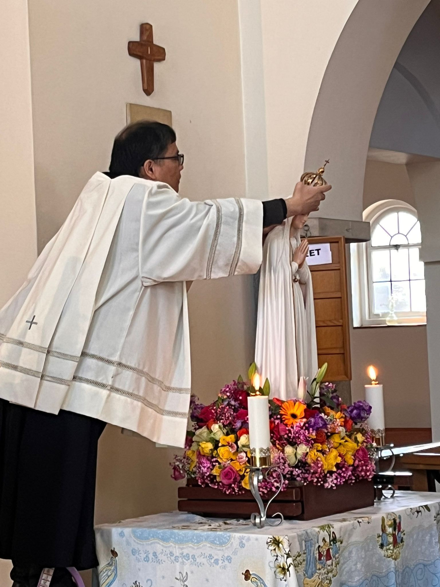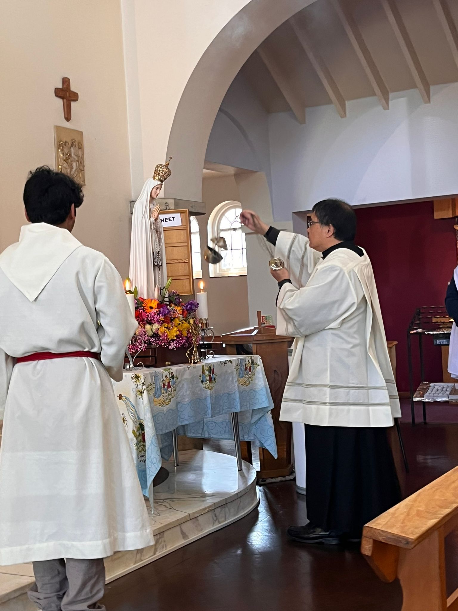 The parish community, led by Fr Antonio Pineda, gave Our Lady a heartfelt welcome. The celebration began with a joyful procession, bringing together parishioners and visitors. The statue, beautifully adorned with vibrant flowers, was carried into the church by Confirmation candidates. She was then crowned and honoured with incense, together with the relics of the Fatima saints.